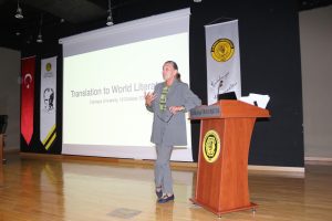 Günün ilk konuşmasını Prof. Dr. Adelheid Rundholz (Johnson C. Smith University, ABD) gerçekleştirdi. Rundholz, çeviri pratiği ve dünya edebiyatı ilişkisini, kültürlerarası dolaşımın dinamiklerini ve çevirinin edebi kanonların oluşumundaki rolünü ele alan kapsamlı bir sunum yaptı.