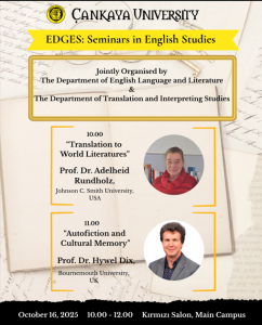 Çankaya Üniversitesi İngiliz Dili ve Edebiyatı Bölümü ile İngilizce Mütercim-Tercümanlık Bölümü tarafından ortaklaşa düzenlenen “EDGES: Seminars in English Studies” etkinliği, 16 Ekim 2025 tarihinde Kırmızı Salon’da başarıyla gerçekleştirildi.