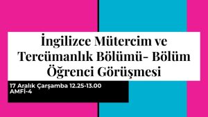 İngilizce Mütercim ve Tercümanlık Bölümü olarak, 17 Aralık Çarşamba günü 12.25–13.00 saatleri arasında AMFİ-4’te bir Bölüm–Öğrenci Görüşmesi düzenlenecektir. Görüşmede bölümle ilgili güncel konular, önerileriniz ve sorularınız değerlendirilecektir.