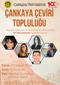 3 Nisan 2024 tarihinde Bölümümüzün ilk mezunlarıdan, Muratcan IŞILDAK, Ebru COŞKUN AKSU ve Aras GÜVEN Çankaya Çeviri Topluluğunun davetlisi olarak katıldıkları söyleşide öğrencilerimizle buluştular.