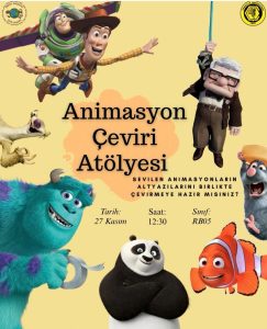 Çankaya Üniversitesi Çeviri Topluluğu tarafından düzenlenen Animasyon Çeviri Atölyesi, 27 Kasım tarihinde RB05 sınıfında gerçekleştirildi.